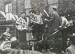 В Великобритании особую популярность снискал скиффл — ритмический стиль, берущий начало в джазе, британском фольклоре и кантри[11]. Лонни Донеган, выпустив «Rock Island Line», сделал многое для быстрого распространения скиффла на танцплощадках. Этому также способствовала простота музыкального рисунка и доступность инструментов для исполнения. Повсеместно появляются группы, состоящие из гитары, банджо, губной гармоники и стиральной доски. Будущие битлы, как и тысячи их сверстников, не получив никакого музыкального образования, взяли в руки инструменты, следуя всеобщему музыкальному увлечению. По некоторым оценкам, в Великобритании в 1956—1957 годах было до пяти тысяч любительских скиффл-групп[12]. Как вспоминал Джерри Марсден, лидер группы Gerry and the Pacemakers, для ливерпульских групп был характерен свой стиль: мелодическая основа скиффла, утяжелённая рок-н-ролльными риффами[13].