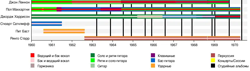 The Beatles (МФА: [ðə ˈbiː.tlz], рус. Битлз; также группу называют «Ливерпульской четвёркой», Liverpool Four; отдельно участников ансамбля называют «битлами»; в английском языке также распространено упоминание группы как Fab Four — «Великолепная четвёрка»[7]) — британская рок-группа из Ливерпуля, основанная в 1960 году, в составе которой играли Джон Леннон, Пол Маккартни, Джордж Харрисон и Ринго Старр. Также в разное время в составе группы выступали Стюарт Сатклифф, Пит Бест и Джимми Никол. Большинство композиций The Beatles создано в соавторстве и подписано именами Джона Леннона и Пола Маккартни. Дискография группы включает 13 официальных студийных альбомов, изданных в 1963—1970 годах, и 211 песен[8].