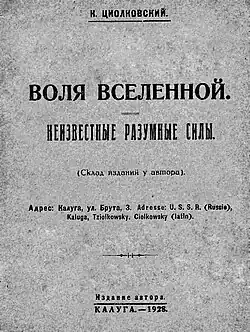 - Циолковский К. Воля вселенной: Неизвестные разумные силы. — Калуга: Гостипография КГСНХ, 1928. — 23 с.