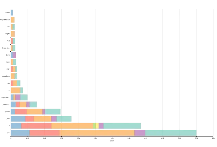Гистограмма показывает, сколько ПО было написано на том или ином языке программирования, и какая часть из них работает под той или иной ОС