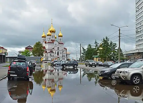 15Собор Михаила Архангела, набережная Северной Двины, 51. Грандиозный (в смысле размеров) кирпичный собор с белой мраморной облицовкой был построен в 2008-2019 годах на берегу Северной Двины. Своим посвящением он обязан древнему Михаило-Архангельскому монастырю, располагавшемуся на берегу все той же реки, хотя и в других местах: до пожара 1636 года он стоял на мысу Пур-Наволок, а после него монастырь был заново построен выше по течению от нынешнего местоположения собора. Монастырские постройки XVII века были разобраны в 1930-е годы.авг2020