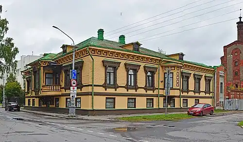 9Особняк А. Суркова, улица Попова, 1(пересечение с набережной Северной Двины). Украшенный резьбой деревянный особняк был построен в 1851 году и принадлежал крупному архангельскому промышленнику Альберту Суркову. Сейчас в здании находится детская школа искусств. Рядом можно увидеть находящийся в безобразном состоянии, но всё еще живописный комплекс зданий пивоваренного завода Суркова.июн2015