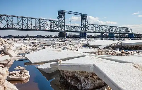 Ледоход на Северной Двине рядом с железнодорожным мостом