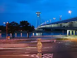 - Мост SNP так же известный как Nový most с 1993 до 2012 (рядом с Кафедральным Собором Святого Мартина и берегом Дуная) трамваи в сторону запада и автобусный маршрут до Petržalka.