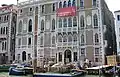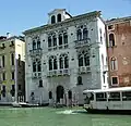 ![]() | 17 Ка' да Мосто (Ca' da Mosto). Построен в XIII веке в венето-византийском стиле, является самым старым зданием, построенным на Гранд-канале. Изначально дворец создавался как дом торговца, первого владельца здания. Второй этаж был добавлен в начале шестнадцатого столетия, а третий уже XIX веке. Дворец получил свое название от фамилии венецианского путешественника Альвизе да Мосто, который родился в этом дворце в 1432 году. Дом оставался во владении фамилии да Мосто вплоть до 1603 года, когда тогдашний владелец здания Чиара да Мосто завещал его племяннику, который носил фамилию отличную от да Мосто. С XVI по XVIII век в дворце размещалась известная гостиница Albergo Leon Bianco (Отель Белый лев). В 1769 и 1775 годах в гостинице останавливался император Священной Римской империи, сын императрицы Марии Терезии Иосиф II во время своего пребывания в Венеции. В настоящее время дворец не используется, так как во время наводнений был нанесен ущерб основанию здания. Дворец нуждается в реставрации. Владельцем здания является граф Франческо да Мосто, современный итальянский архитектор и продюсер. Одной из его целей в жизни является восстановление дворца. |