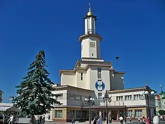 1☆Ратуша(Івано-Франківська ратуша), пл. Ринок. Станиславской ратуше не везло: её разрушали несколько раз, последний — в годы Первой мировой войны. Восстановили здание в 1929-32 гг. в стиле, который часто называют конструктивизмом, хотя скорее это ар-деко, на что указывают, например, небольшие барельефы и даже античные вазы на фасадах. Форма же ратуши — совершенно конструктивистская: башня на крестовом основании, хотя в полной мере оценить этот замысел можно только с высоты. Странные каменные «гребешки» на карнизе замещают польских бронзовых орлов, снятых в советское время. Внутри находится краеведческий музей. Ратуша стоит на бывшей рыночной площади, где трудно не заметить и странный фонтан с побитым яйцом. Считается, что он символизирует писанку — разрисованное пасхальное яйцо, но есть и более интересная народная версия. В 2004 году в Ивано-Франковск приезжал небезызвестный Виктор Янукович (на тот момент премьер-министр, а позднее пророссийски настроенный президент Украины), и кто-то из толпы метнул в него яйцо, от чего тот немедленно упал без чувств. Это вызвало всеобщие насмешки и получило соответствующее освещение в местной прессе, написавшей, что «Янукович не снёс яйца».май2023