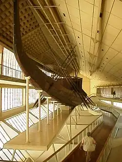 (вдоль южной стороны Великой пирамиды). Когда Хуфу умер, для перевозки его мумифицированного тела и похоронных принадлежностей по Нилу использовались пять церемониальных лодок; затем их перетащили к пирамиде. Мумию и вещи захоронили внутри, а ладьи захоронили вдоль восточной стороны. Хуфу намеревался отплыть в загробную жизнь на этих ладьях, а затем ежедневно сопровождать бога-солнце в его каждодневном плавании по небесам. «Солнечные ладьи» были изготовлены из ливанского кедра. Одна ладья была тщательно заново собрана из фрагментов и выставлена тут, будучи вероятно самой старой существующей лодкой. Остальные были перезахоронены в камерах.