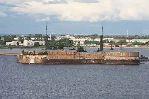 2Форт "Тотлебен"("Первомайский").Форт построен на искусственном насыпном острове в период 1896-1914 годов. Находился на вооружении до 1960-х годов. Назван в честь знаменитого фортификатора Э.И.Тотлебена. В настоящее время охраняется от вандалов группой энтузиастов. Попасть на форт можно водными видами транспорта или зимой по льду.дек2015