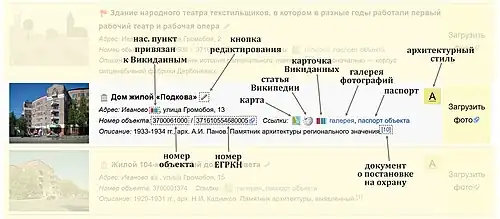 Каждый объект культурного наследия задан с помощью шаблона {{monument}}, параметры которого позволяют структурировать всю нужную информацию. Ниже перечислены основные параметры этого шаблона, а его полную версию можно посмотреть тут.