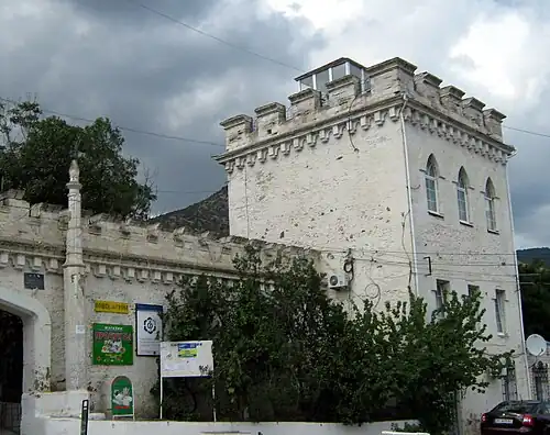 1Дом для приезжающих Голицына(рядом с остановкой рейсового автобуса из Судака). Здание выстроено в конце XIX века в популярном в дореволюционном Крыму мавританском стиле и представляет собой расположенные квадратом четыре трёхэтажные башни с зубчатыми крышами, соединённые с трёх сторон крыльями меньшей высоты, а с передней стороны зубчатой стеной с воротами, в единую монументальную постройку. Ворота оформлены пилонами в форме стилизованных минаретов и ведут в камерный внутренний двор. Сегодня здание занято под жилые, офисные и административные помещения, обвешано рекламой и облеплено разнокалиберными пристройками. Можно встретить утверждения, что в проектировании участвовал московский архитектор Фёдор Шехтель.