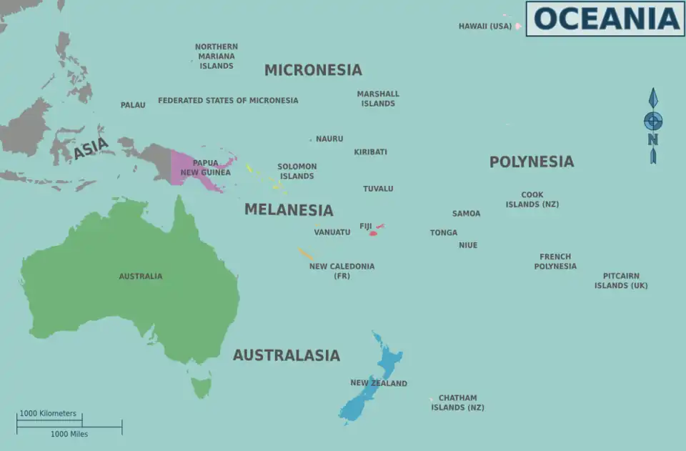 В Океании выделяют 4 крупных региона с не совсем четкими границами: Австралазия, Меланезия, Микронезия и Полинезия.